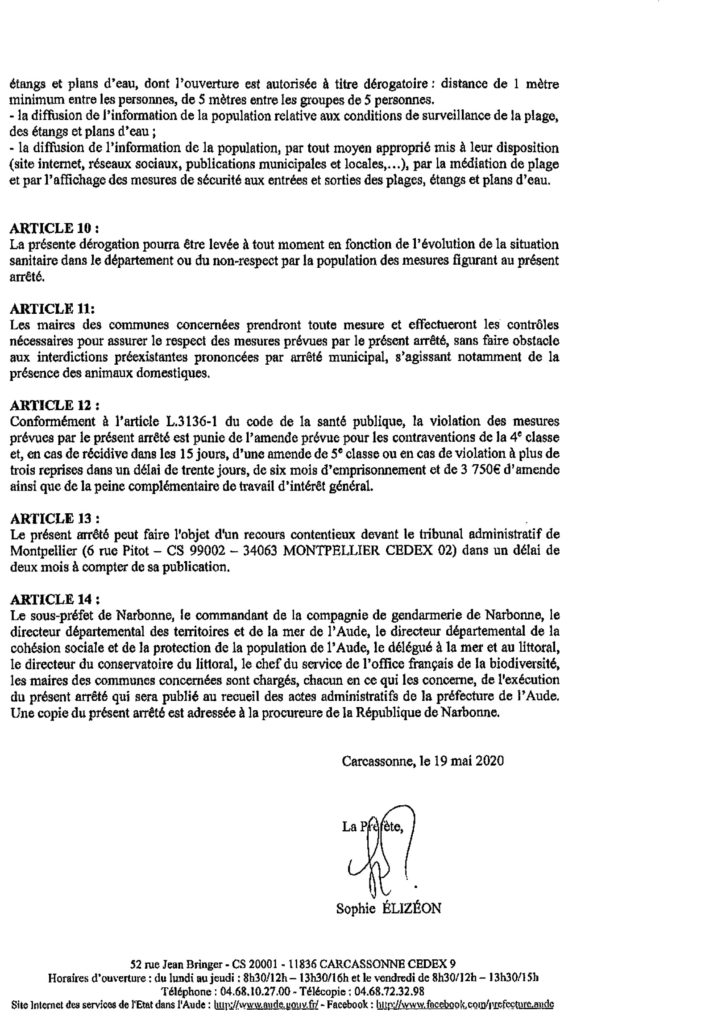 Arrêté Préfectoral autorisant à titre dérogatoire l’accès aux plages, étangs et plans d’eau modifié 19 mai 2020Actu La PalmeMarie-Laure Constans